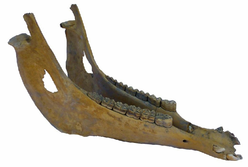 De weliswaar gebroken maar toch nog volledige onderkaak van een paard was te voorschijn gekomen bij het uitgraven van de oude haven van Hulst en lag wekenlang in weer en wind in een hoekje van het werkterrein. Niemand had er belangstelling voor en uiteindelijk nam een van de leden van onze Werkgroep die regelmatig een handje kwam helpen bij de opgraving het als "hebbeding" mee naar huis. Dit uiteraard pas na gevraagde en gekregen toestemming van de verantwoordelijke archeoloog.
