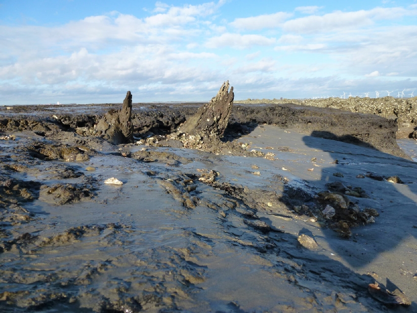 Na een korte tocht door de modder werd de locatie bereikt. Door de werking van het getij eroderen de schorren op deze plek erg en daardoor komt de middeleeuwse leeflaag te voorschijn. De oorspronkelijke kavelverdeling is aan de hand van slootresten goed te zien. Verder liggen er uiteraard veel potscherven, maar ook funderingsresten komen van tijd tot tijd te voorschijn.