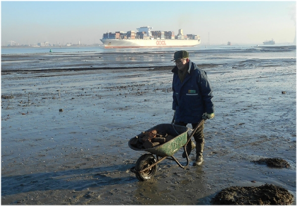 Edie aan het sjouwen in de Saeftinghe bij het veiligstellen van de vuurboet