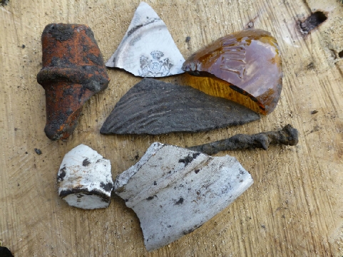 Om half een ben ik naar huis gereden om wat te eten en weer op temperatuur te komen. Na een dik uur was ik terug. De sleuf had toen een diepte van twee en een halve meter en was al meer dan vijftien meter lang. Je zag nu duidelijk (aan beide zijkanten) hoe de bodemlagen gevormd waren. Ook was te zien dat er een afvalput(je) was doorsneden. De voorwerpen die hier begraven lagen waren echter niet zo oud; twintigste eeuw werd er geschat. Scherven van Maastrichts aardewerk, metaal met schroefdraad en bierflessen met beugelsluiting van brouwerij Van Tilt uit Leuven.