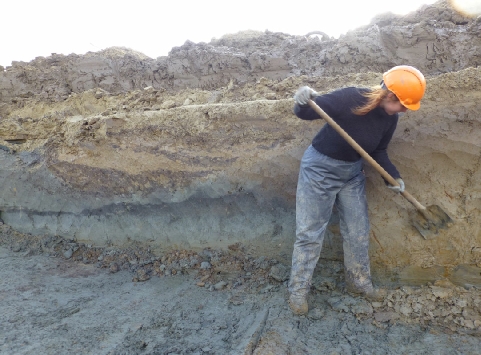 De kraanmachinist was ondertussen begonnen om veertig meter naar het noorden een andere sleuf dicht te gooien. Deze was al eerder gegraven en liet op geringe diepte het dekzand zien met daar bovenop de later gevormde kleilagen.